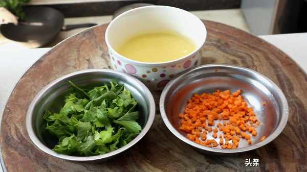 2.胡蘿卜半根,切成胡蘿卜碎,小米粥裡面加入胡蘿卜,既能增加營養,也能使小米粥更加香甜,芹菜葉一小把,用刀切碎,放入小盆裡面。