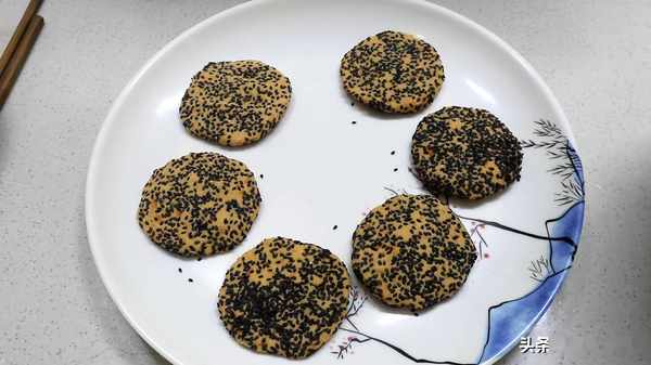 4.準備一個小盆,倒入一把黑芝麻,用手拽一塊面團,團成圓球放入黑芝麻盆裡裹勻,然後拍成圓餅,放入盤中備用。