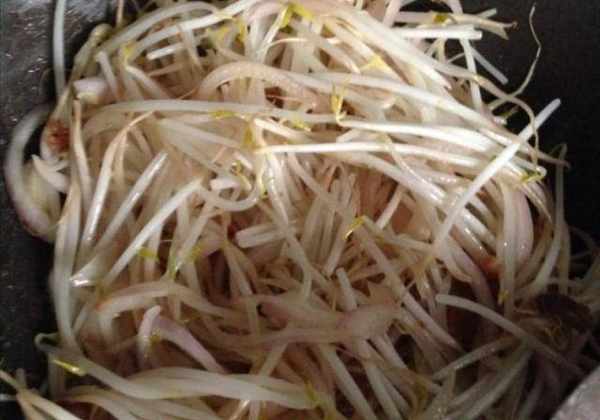 大火,將洋蔥放入鍋中迅速翻炒,接著放入豆芽,豆芽炒熟後,放入雞蛋混合翻炒。