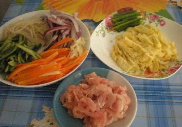 準備食材:綠豆芽60克、韭菜30克、洋蔥60克、雞蛋1個、幹粉絲30克、豬瘦肉50克、小蔥1根、大蒜2瓣、生薑1小塊、生抽1勺、老抽半勺、食鹽1.5茶匙、食用油適量、淀粉少量、雞精少許。