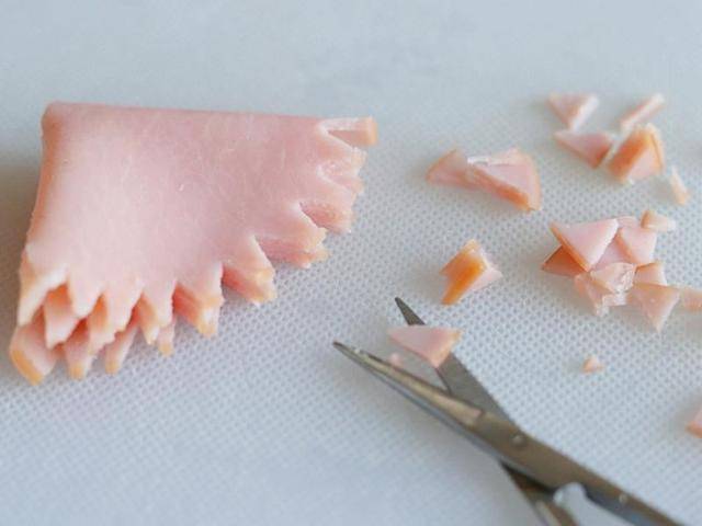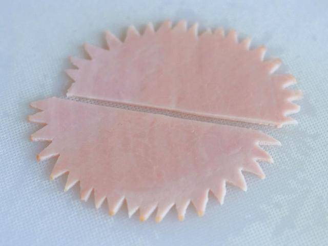 1、準備材料很少,輕松又快速~馬上動手試試囉!火腿片1片。輕輕對折(不要折斷唷)。再對折成四分之一(一樣輕輕的)。用小剪刀剪出尖尖的鋸齒狀。