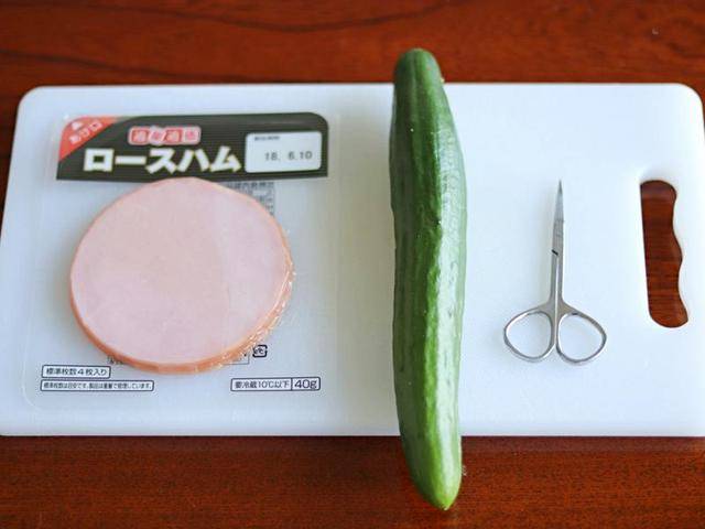 食材:火腿片4~5片、小黃瓜半條~1條、小剪刀1支、削皮刀1支、小刀1支