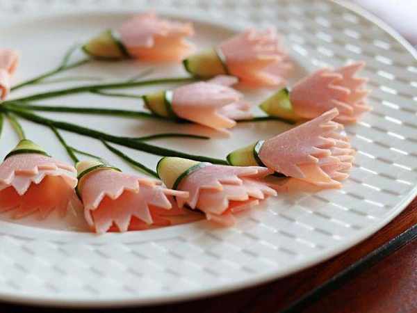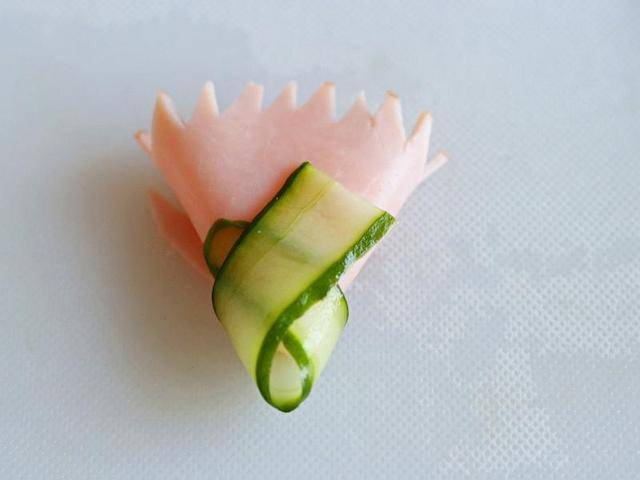 3、包在火腿花下方(正面)。背面是這樣。用小刀劃出數條細黃瓜皮。擺在盤上,當作康乃馨的花枝。放上做好的康乃馨就完成囉!(蝴蝶結可利用剩下的火腿片做成喲!)可愛的康乃馨火腿拼盤是不是很簡單呀?希望大傢都有個溫暖快樂的母親節唷!