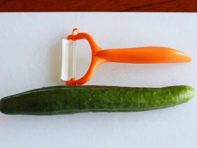 2、打開後是一個圓形齒輪狀。對切成兩半。左邊往右拉(稍微往下放一點。)將右邊往上拉(力道要輕唷!)小黃瓜洗凈。用削皮刀輕輕削出數條薄片。切成4~5公分小段。