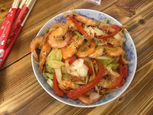 【大蔥油燜蝦】食材:大蝦,大蔥,紅彩椒,生薑。