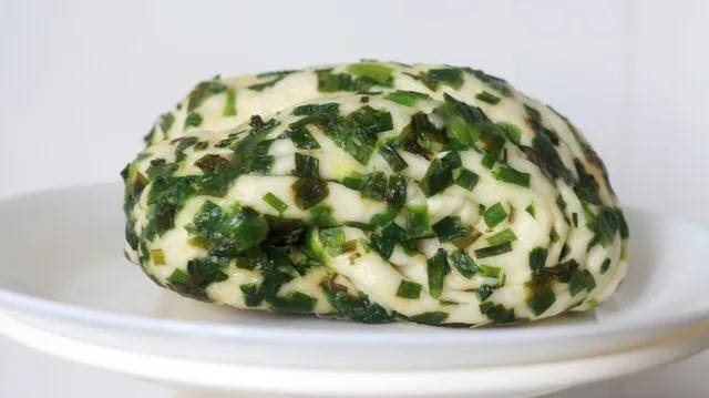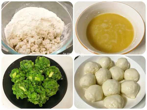 (3)等不燙手瞭把切好的蔥花放進去,搓成大小均勻的蔥酥球,如果粘不夠不容易成團,可以再加一些面粉