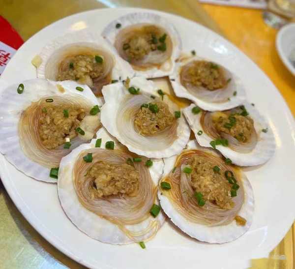 第六道菜是粉絲蒸扇貝,這道菜是最常見的一道海鮮菜肴,幾乎全國各大餐館裡都會做,將扇貝肉清洗幹凈,然後放入少許龍口粉絲。