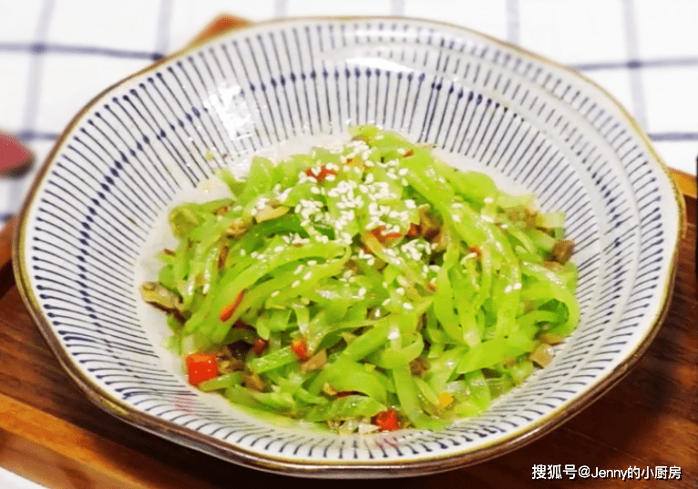 最後將萵筍絲和料汁攪拌均勻,裝盤後撒些熟白芝麻,就可以上桌瞭。