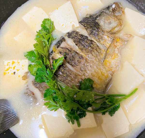3.放入煎好的魚,倒入約2000ml的溫水,大火煮開後,中火熬至湯色變白。放入豆腐,中火燉3~5分鐘。放入少許的白胡椒粉提鮮,放入少許(依個人口味)的鹽調味,盛出鯽魚豆腐湯,撒上少許的香菜即可。