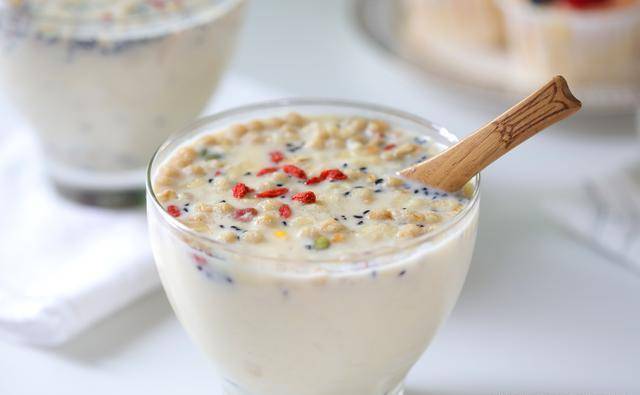 第五步:碗中加入適量堅果,倒入熱牛奶蛋酒釀攪拌均勻,更加美味。