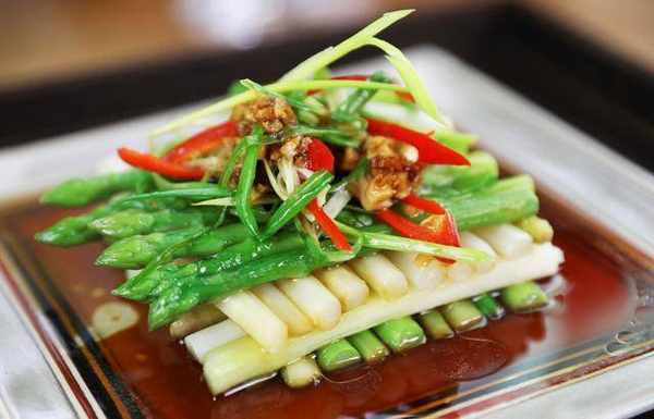 第六步:油鍋燒熱,加入蒜、鹽、雞精調味,再加入蒸魚和醬油調汁。第七步:最後把自制的醬汁澆在擺好的蘆筍上就可以吃瞭。