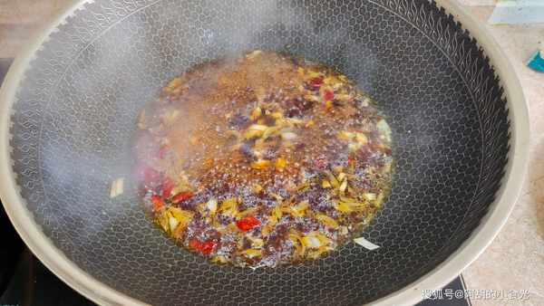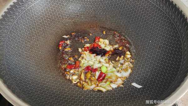第四步:開始烹飪,鍋裡燒油加入幹辣椒和蔥蒜爆出香味,接著淋入一圈生抽嗆出香味,再加入2湯匙蠔油簡單炒幾下,直接加入開水一碗,加入食鹽調一調味道,一點老抽調色。