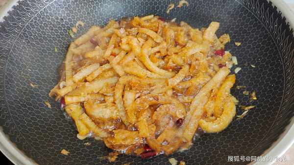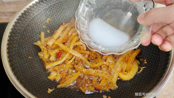第五步:將皮肚絲下鍋翻拌均勻,使其和湯汁充分地拌勻,而後改為中小火燒個3分鐘時間,待皮肚絲吸飽瞭湯汁,就淋入少許水淀粉使剩下的湯汁變的稍微濃稠起來。