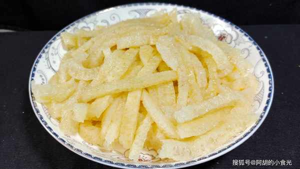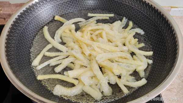 第二步:泡好的皮肚直接切絲,別切的太細,而後因為皮肚含有很多油,所以要用溫水多多地沖洗幾遍,最後開水下鍋,加入料酒進行焯水2分鐘,最後撈出來用勺子壓一壓,擠幹水分備用。