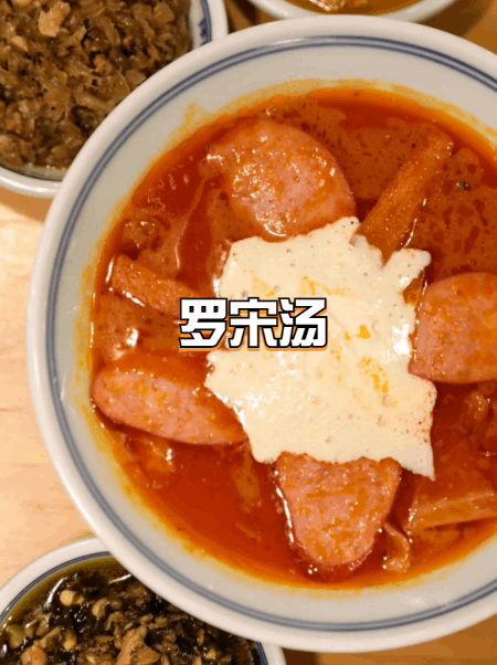這碗羅宋湯的配方同樣源自紅房子。湯體偏濃稠,加入瞭俄羅斯酸菜,相比本幫羅宋湯會更酸一點。炸土豆、炸胡蘿卜、紅腸,還要在頂層加入一大勺鮮奶油,給羅宋湯增添瞭十足的奶味。