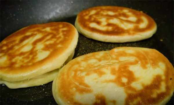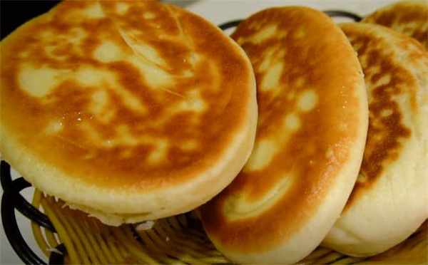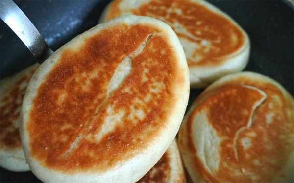 8.平底鍋預熱好之後就可以刷油瞭,把餅胚放進去,蓋上蓋子開始烙,烙至底面上色的時候就可以翻面瞭,刷一層油,現在給它翻面,蓋上蓋子繼續烙,一直烙到兩面金黃,按壓可以快速回彈,咱們這個餅就做好瞭。
