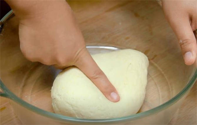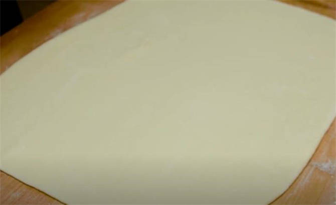 2.大約半個小時,現在咱們這個面就已經發好瞭,這個面有點粘,上面撒一些幹面粉,這樣容易取出來,取出來之後排排氣,按一下,慢慢的均勻的用力搟開,把它搟成長方形的面片就可以瞭。