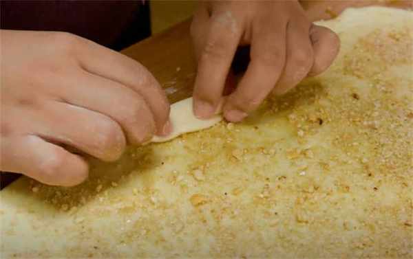 3.表面刷一層油酥,刷好之後上面撒一些調好的花生餡料,平鋪好後把它卷起來。