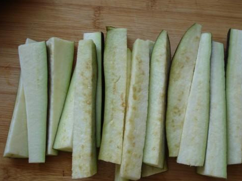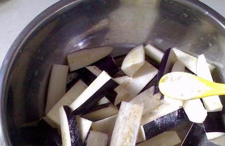 茄子皮中含有豐富的維生素B,有助於促進維生素C的吸收,所以茄子最好不要去皮。茄子洗凈後,切成條狀放入盆中,在盆中放入兩勺鹽,攪拌均勻後醃制20分鐘。