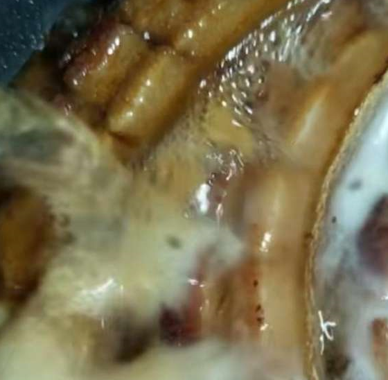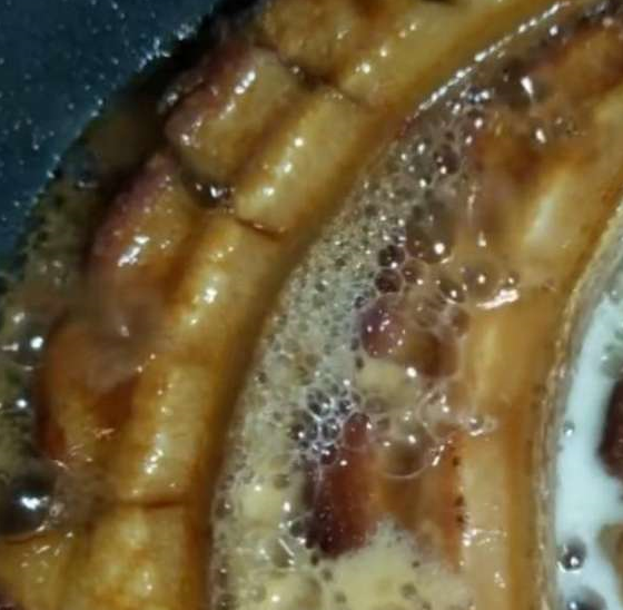 煮好之後把五花肉撈出來控掉水,再放到鍋中煎。