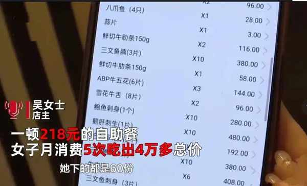 貴陽一傢和牛日料店主打自助餐。顧客吃自助餐時,並非拿著盤子自選,而是對著菜單點餐。從2022年1月開始,一名女性顧客經常前來消費,而且點餐量巨大。2022年9月1日,店員通過監控發現,該女士用小塑料袋將所點的食物偷偷打包帶走,而且偏愛那些比較貴的食物,像三文魚北極貝、法式鵝肝等,她會一點好幾份打包帶走。店方查看該女士此前一個月的點單記錄和視頻監控發現,2022年8月16日、8月17日、8月24日、8月29日,她四次來店裡,點單金額分別為9135元、9106元、10328元、11130元。算上9月1日那一次,她五次共計點餐45653元。但由於是固定費用的自助餐,她每次隻需按218元買單,加上優惠,五次實際支付僅1010元。店裡還發現,在去年8月之前的約半年時間內,該女士來店裡吃瞭多次,點餐金額也很大。但由於監控過期,當時她有沒有偷偷打包,店方無法確認。事後,店方聯系瞭這位女士,要求她按菜單價格補齊2022年8月到9月那五次的餐費,但這位女士不同意。於是,今年3月,店方向法院起訴,要求她補足餐費。5月12日,店方和這名女士已達成庭前和解。經核算,顧客向店方補交瞭44543元餐費,同時承擔8000元訴訟費用,這筆共計52543元的款項已打到店方的賬戶中。