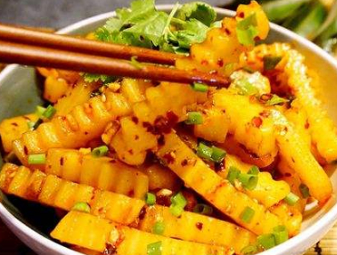 狼牙土豆:土豆削皮。用花刀切成條。放入水中,洗去表面的淀粉。把土豆條煮至8成熟後撈出,晾幹水分。炒鍋倒油,放入辣醬小火炒香。放入土豆條,少許鹽小火煸炒。土豆條完全成熟後放入孜然粉。放入花椒粉。翻炒均勻後撒入蔥末,拌勻即可。咸香微辣的狼牙土豆。
