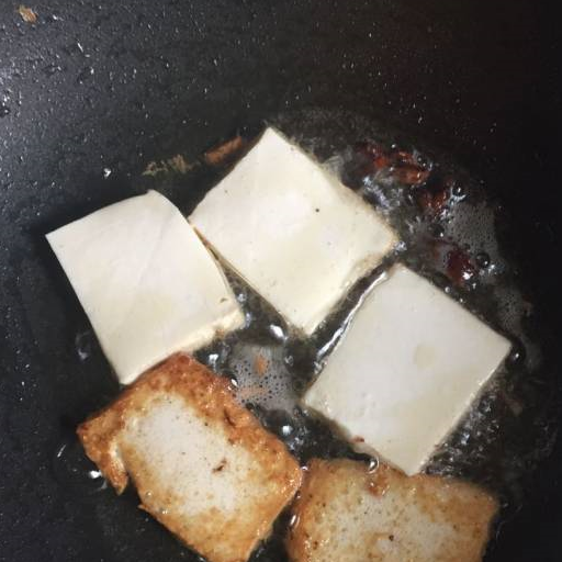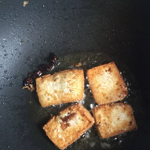 第3步、不粘鍋裡倒入食用油加熱,放入八角,放入豆腐,中火慢煎,稍稍翻動