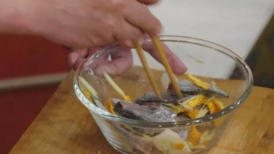 帶魚表面改刀切段,吃完的橘子皮切絲。加入少許薑絲、蔥段,1勺料酒,攪拌均勻。