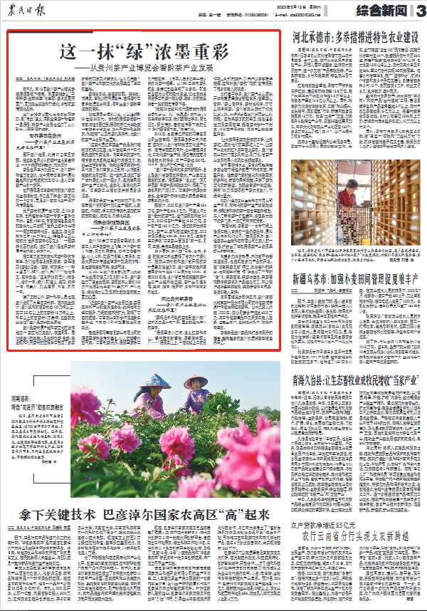 5月13日,《農民日報》刊發報道《這一抹“綠”濃墨重彩——從貴州茶產業博覽會看黔茶產業發展》,聚焦黔茶產業發展通過貴州茶博會完成從小到大、從弱到強的嬗變,茶博會是貴州茶品牌打造與展示的舞臺,越來越多的貴州優質好茶正被世界看見。