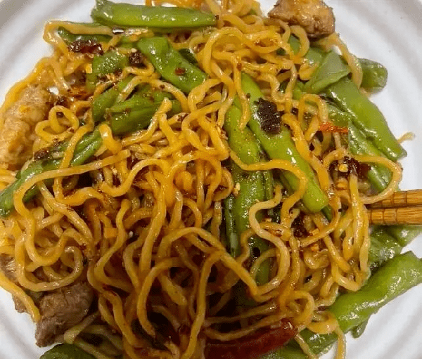 將豆角處理幹凈後切成小段,在醬油及生抽的調味下煸炒至半熟,再加入適量清水並燒開,放入經過預處理的面條,小火燜煮至面條軟糯,這樣能讓豆角汁在煨煮的時間中充分滲透入面的每一寸。