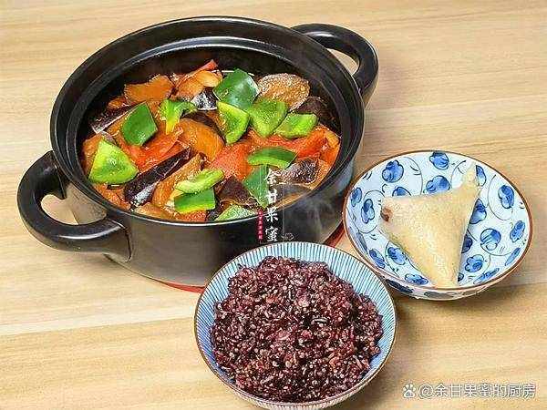 第一天:西紅柿燒茄子+紫米飯+粽子