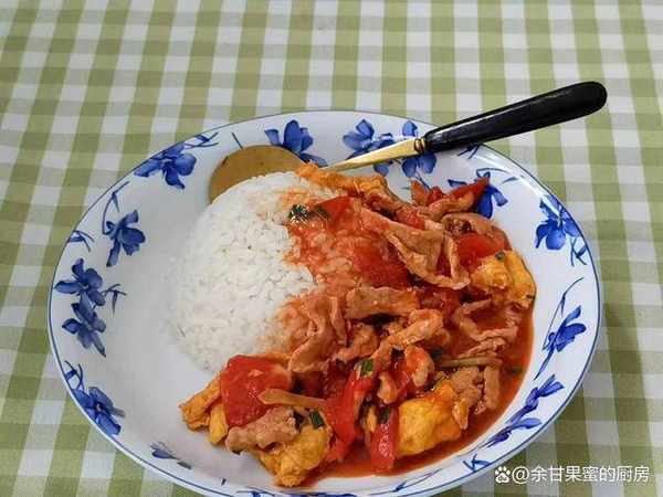 做法:將瘦肉加入薑蔥、食用油醃一下,入鍋炒至變色裝出,雞蛋炒熟,加入番茄多炒幾下,加入瘦肉、雞蛋、醬油,開水,適量的番茄、精鹽調味,出鍋,裝在米飯之上即可。