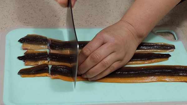 3、 鱔魚從後背劃開,去掉內臟和骨頭,再清理幹凈切成小段。