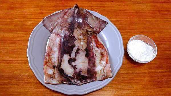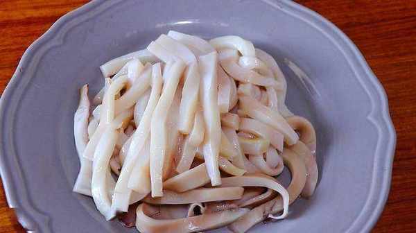 1、 魷魚處理幹凈內臟,再把表皮撕掉清洗幹凈,切成大小均勻的條狀。