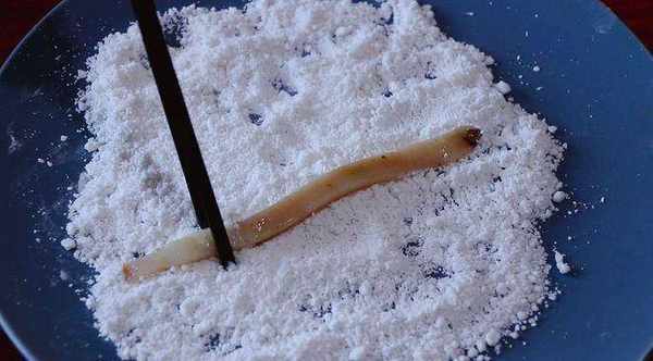4、 鍋中倒入足量的油,油溫6成熱後,先把魷魚肉表面粘滿紅薯淀粉,再一個個下入油鍋中炸制。