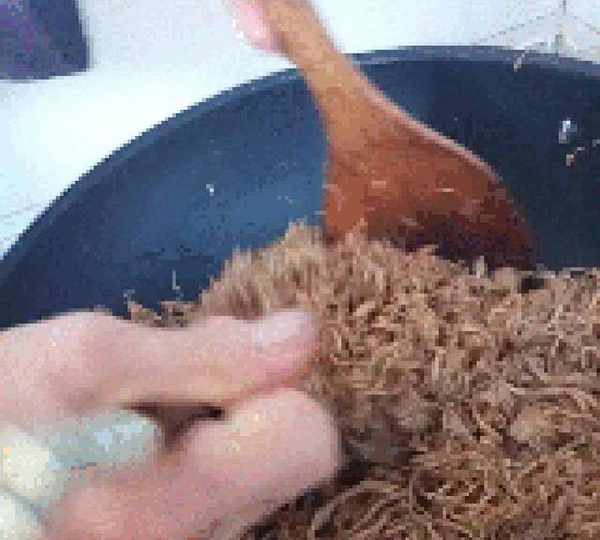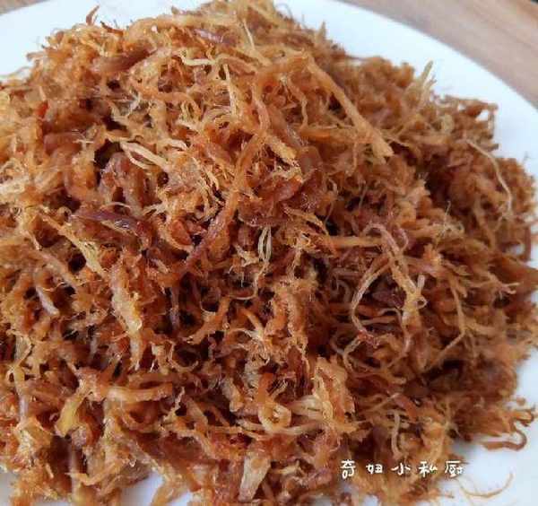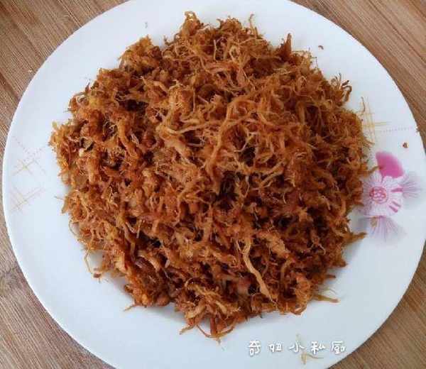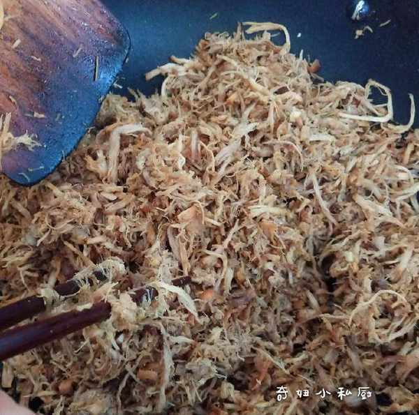 7.炒到肉松蓬松起來就好瞭,冷卻後就可以裝到罐子裡瞭。