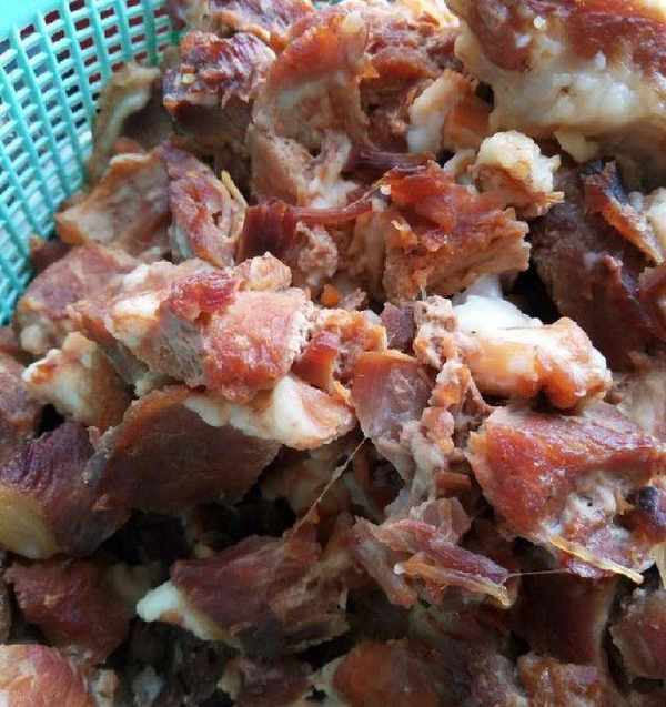 4.將壓煮好的肉塊,撈在籃子裡晾幹水分。