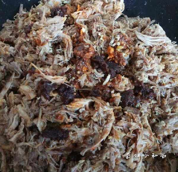 5.將肉塊用手撕成肉絲同時剔除多餘的脂肪,加進大半碗淡鹽醬油,蒜末,薑末,小半碗雨露,一罐古龍肉醬,少許沙茶醬,少許料酒,少許的陳醋,攪拌均勻,量可以根據口味來做適當的調整,備用。