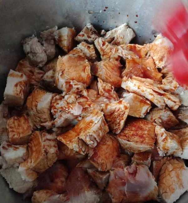 2.我這邊是已經焯過水的豬肉瞭,就直接的去皮和肥肉部分,將瘦肉切塊,小塊也可以,肉片也可以,將切好的肉塊放進電壓鍋裡,然後加進少量的淡鹽醬油,調“蹄筋”檔,壓煮至軟爛。