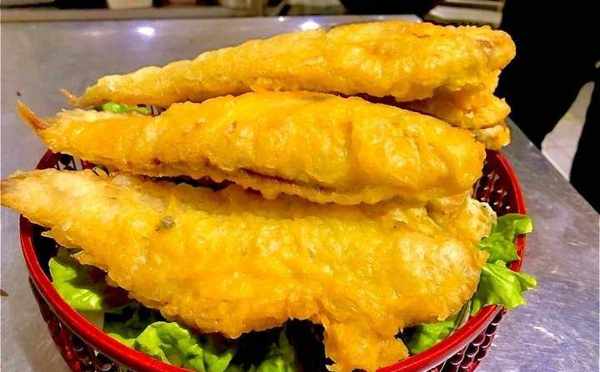 把舌板魚掛糊後放入鍋中炸制金黃撈出控油擺盤即可