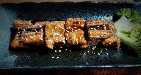 用鱔魚骨煎香後加入少許的水熬制成湯,蘋果打成泥取汁,蒜和蔥爆香之後淋入湯中,加入紅酒和蘋果汁,調入燒汁熬煮成燒汁,小火慢熬大概10分鐘,湯濃稠後下入白芝麻即可