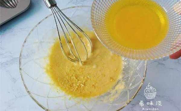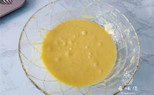 3.黃油融化成液體,檸檬洗幹凈把皮屑擦下來,白色部分不要擦下來哦。再把這兩樣一起倒入面糊裡混合均勻