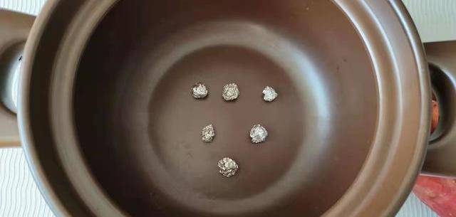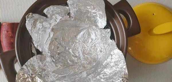 2.砂鍋底部放入一個小金屬架子,如果沒有可以用錫紙團成小球代替,在底部鋪一層,這是為瞭使紅薯與鍋底部隔離,避免挨著鍋底的部分烤糊
