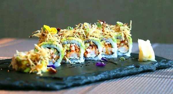 天婦羅炸蝦、蟹子、章魚、黃瓜絲、酪梨、牛蒡絲、壽司飯、紫菜、食用花、鰻魚汁