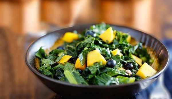 羽衣甘藍、芒果、藍莓、煉乳、沙拉醬、橄欖油