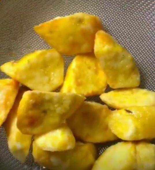 油溫7-8成熱下入地瓜,剛下去不要攪拌,讓它定型。