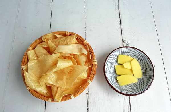第三步:把腐竹洗幹凈,剪成小塊;生薑去皮洗凈切片。