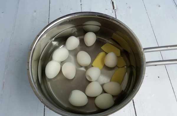 第四步:鍋中倒入適量清水,放入鵪鶉蛋和薑片煮5分鐘。