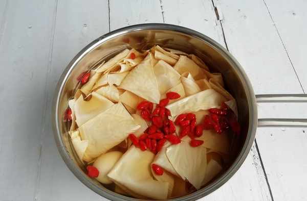 第五步:放入腐竹、紅糖、枸杞再煮5分鐘,即可出鍋享用。這種薄薄的腐竹很滑很香,在專門做豆腐的店裡可以買到。如果用那種比較厚的腐竹可以提前泡幾個小時,這樣就不用煮那麼久瞭。