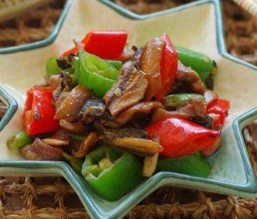 雙色豉椒溜鱔片:.黃鱔洗凈、切成鱔段,青、紅尖椒切塊,芹菜切段,薑切絲,蒜切片,鍋燒熱,放少許橄欖油,油燒熱後,放入薑、蒜爆香,放入鱔段煸炒,炒至魚肉變色,放入青紅椒、芹菜,翻炒1分鐘,加入醬油,加入豆豉,炒勻即可,特別美味。